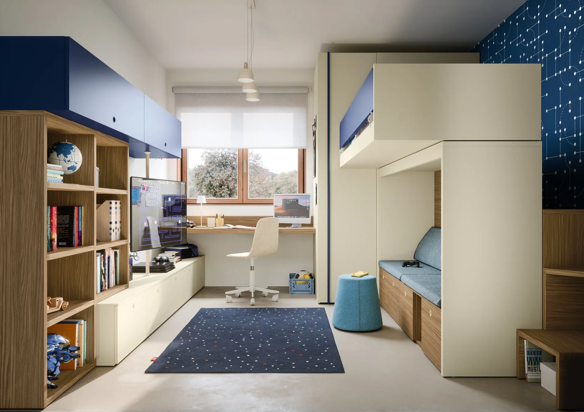 Porta estetica e colori vivaci nella stanza dedicata ai più giovani con questa soluzione, una tra le Camerette con letti a castello per bambini di Nidi. Questa soluzione in melaminico ultima alla perfezione le doti pratiche e il valore estetico della camaretta, in quanto è capace di abbinare funzionalità ed ergonomia. Nidi offre un ricco catalogo di elementi accessori da abbinare su misura: troverai letto, guardaroba, tavolo da lavoro, sedie e librerie. Nell'arredamento della stanza dei piccoli affidati a noi: in negozio presentiamo tutte le più esclusive composizioni arredative moderne per la loro camera.