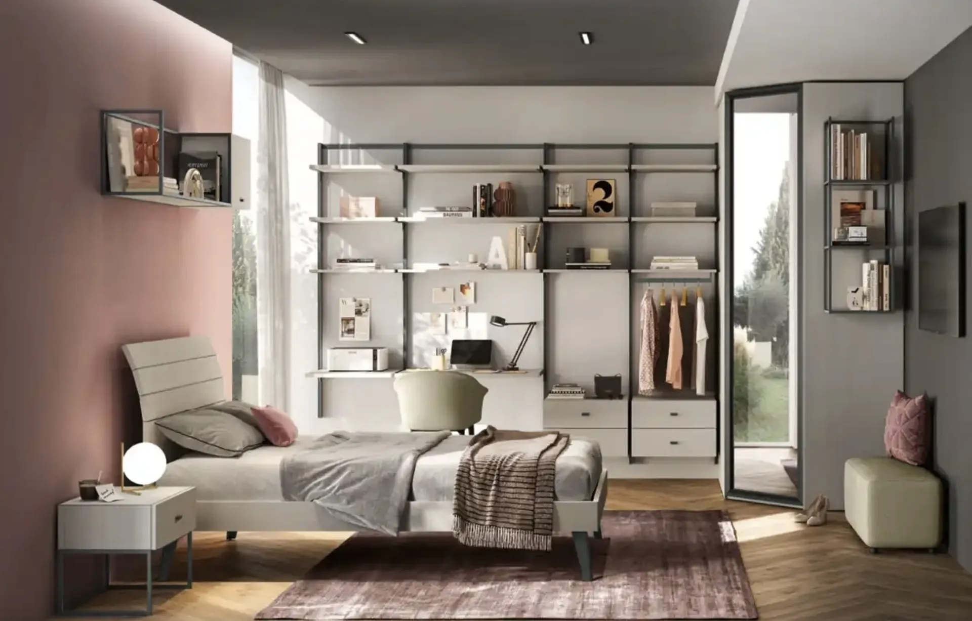 Con questa cameretta Y105 Moretti Compact Camerette, tra le soluzioni componibili, potrai arredare stanze moderne per ragazzi.