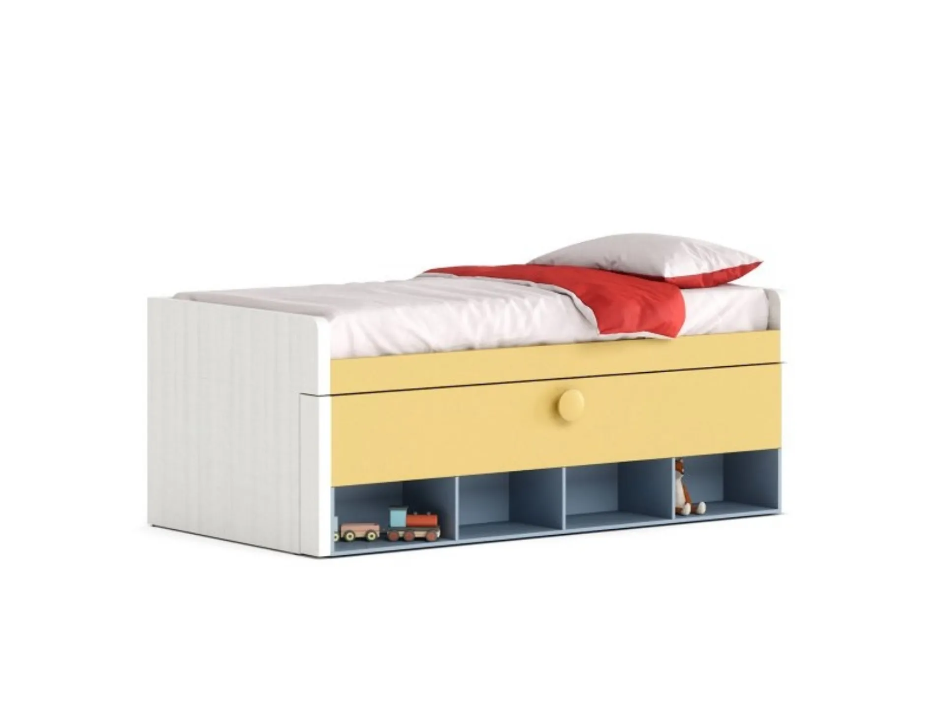 Il letto singolo Pablo in melaminico nella fotografia, tra i modelli con letto estraibile moderni di Nidi, è ideale per garantire il sonno più profondo.