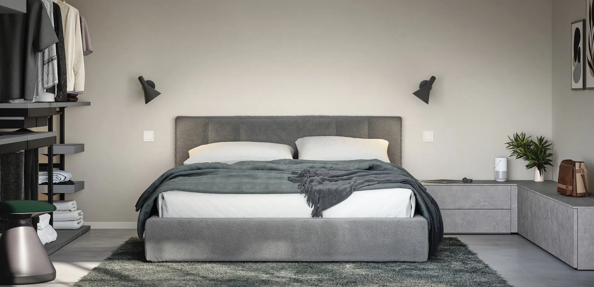 Il letto York in tessuto, tra i modelli imbottiti matrimoniali moderni di Cinquanta3, è perfetto per garantirti il sonno più profondo.